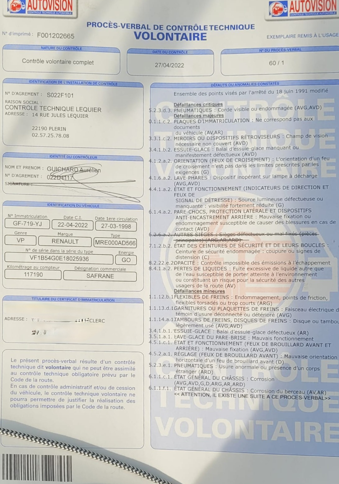 Le CT fait par cette société était presque vierge à l'achat. Après 600 km pour ramener le véhicule chez nous, nous avons des doutes et nous la passons dans un autre centre de notre région le 27 avril. Résultat, une défaillance critique détectée dont la toile visible sur les pneus sous la partie intérieur, donc non visible au 1er abord, sous la roue intérieur. Le véhicule doit être immobilisé le jour même. Le controleur nous indique que la vignette du contrôle initial aurait du être apposée sur le pare brise du véhicule par le contrôleur alors qu'elle est restée accrochée sur le rapport papier. Aussi, plusieurs défaillances majeurs repérées avec une obligation de réparation sous 2 mois. Des défauts qui n'ont pas pu apparaître après notre achat en faisant 600 km mais forcément visible au 1er CT. Le gérant du CT ne trouve rien d'autre à dire qu'il n'a pas vu le véhicule et n'hésite pas à mettre en doute nos propos. Il se décharge et nous demande de nous débrouiller alors que c'est lui qui a délivré le ct ok. À fuir donc car vous pensez acheter une voiture roulante avec un CT au norme et en plus vous faites confiance alors que vous achetez une épave. ATTENTION Ne vous y rendez pas ou n'achetez pas un véhicule si le CT est passé chez eux!!!
